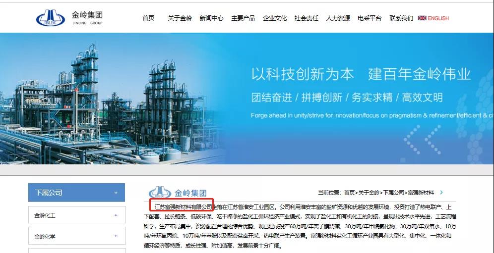 據(jù)相關(guān)工商登記資料江蘇富強新材料有限公司是中國企業(yè)500強——山東金嶺集團在江蘇淮安鹽化新材料產(chǎn)業(yè)園區(qū)投資設(shè)立的鹽化工企業(yè),注冊資金15億元人民幣。