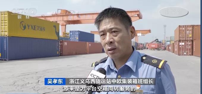 浙江義烏西貨運(yùn)站中歐集裝箱班組長 吳孝東:這個(gè)堆場原來是為平臺(tái)空箱周轉(zhuǎn)服務(wù)的,現(xiàn)在全部都是重箱(裝完貨的集裝箱),空箱三天以內(nèi)就出去了,位置騰出來就是放重箱用,現(xiàn)在在場地里有些也將近等待半個(gè)月了,等著發(fā)。