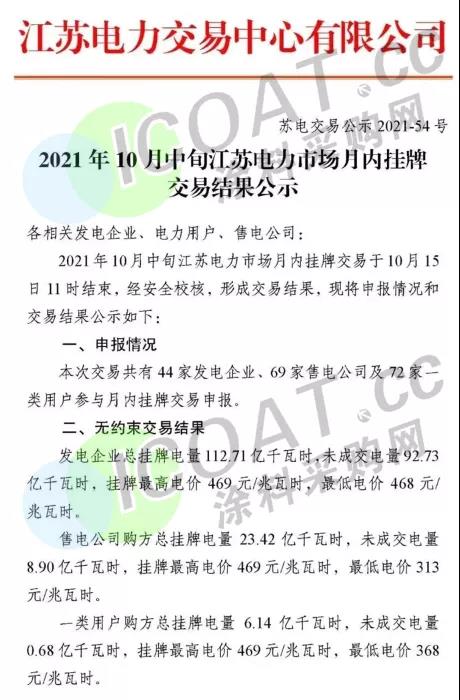 江蘇組織開展了10月中旬月內掛牌交易,共成交電量19.98億千瓦時,成交均價468.97元/兆瓦時,成交價較基準價上浮了19.94%。