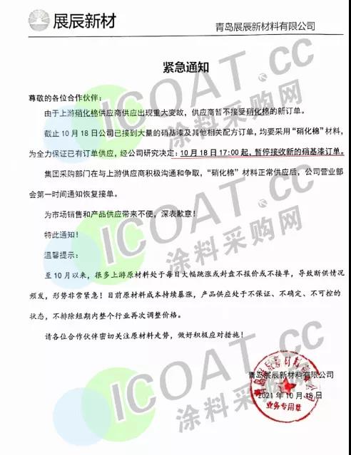 而在此前,青島展辰新材料有限公司發(fā)布緊急通知,稱由于上游硝化棉供應(yīng)商供應(yīng)出現(xiàn)重大變故,供應(yīng)商暫不接受硝化棉的新訂單,為全力保供已有訂單供應(yīng),經(jīng)研究決定:10月18日17:00起,暫停接收新的硝基漆訂單。