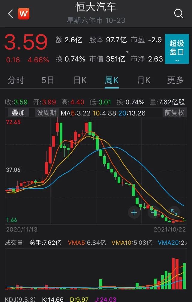 股價方面,自2020年8月恒大健康更名為“恒大汽車”以來,公司在很短時間內市值沖破2000億港元,躍居國內整車上市公司前三名。今年4月19日,恒大汽車創下了70.85港元的高價,登頂之后股價一路下滑。截至10月22日收盤,恒大汽車報收3.59港元,市值351億港元。