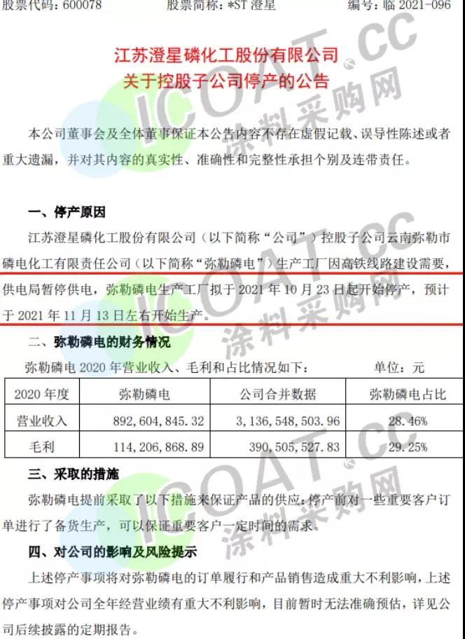 涂料采購網注意到,*ST澄星曾于9月末發布關于公司和子公司停產、減產的公告,其中全資子公司云南宣威磷電生產工廠于2021年9月23日起開始停產,暫時無法預估恢復生產時間。公告顯示,以上停產將對訂單履行和產品銷售造成重大不利影響,對全年經營業績也有重大不利影響,且目前暫時無法準確預估。