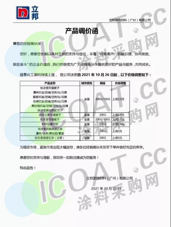 立邦裝飾材料(廣州)有限公司:10月26日起,20KG/15KG規格快涂寶面層膩子、清味抗裂/防堿/防粉化/高強等產品上調2.5元;20KG純態之家面層膩子上調2.5元;20KG/15KG規格批樂寶面層膩子上調2.5元;25KG時時樂膩子粉上調2.5元;20KG快涂寶防堿底層石膏、清味/墻保/美加儷/靚家上調2元;20KG批樂寶底層石膏(重質)上調2元。