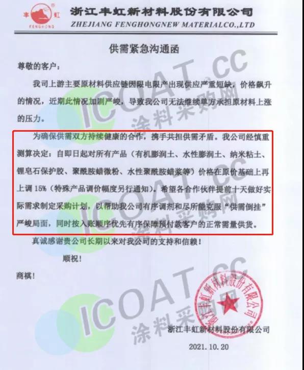 浙江豐虹新材料:即日起所有產品價格上調15%,請提前十天做好實際需求制定采購計劃。