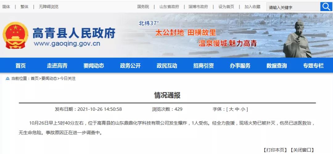 近日,山東淄博高青縣人民政府發(fā)布情況通報(bào),10月26日早上5時(shí)40分左右,位于高青縣的山東鼎鼎化學(xué)科技有限公司發(fā)生爆炸,1人受傷。經(jīng)全力救援,現(xiàn)場(chǎng)火勢(shì)已被撲滅,傷員已送醫(yī)救治,無(wú)生命危險(xiǎn)。事故原因正在進(jìn)一步調(diào)查中。