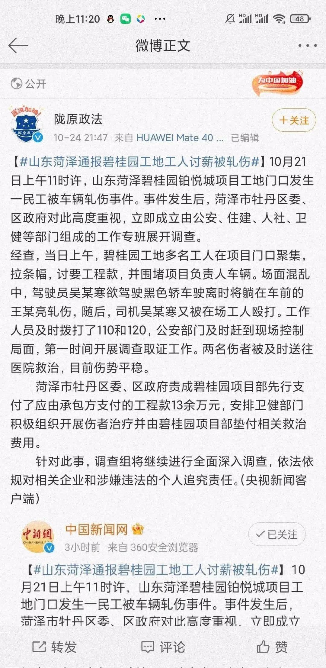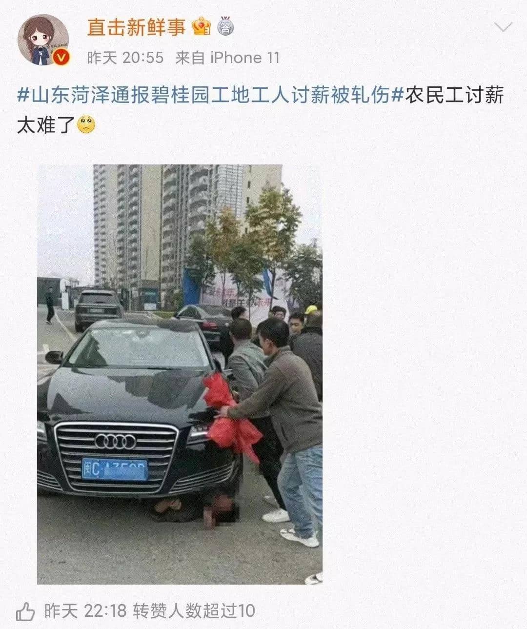 日前,山東菏澤碧桂園工地工人因為討要工資,遭到車輛碾壓。