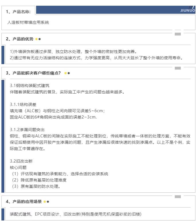 老舊小區改造為了解決老舊小區墻面漏水侵蝕、涂層老化、脫落以及墻面改造過程中產生的噪音、揚塵、基層處理等一系列問題,久諾在行業首家推出“人造板材幕墻應用系統”。