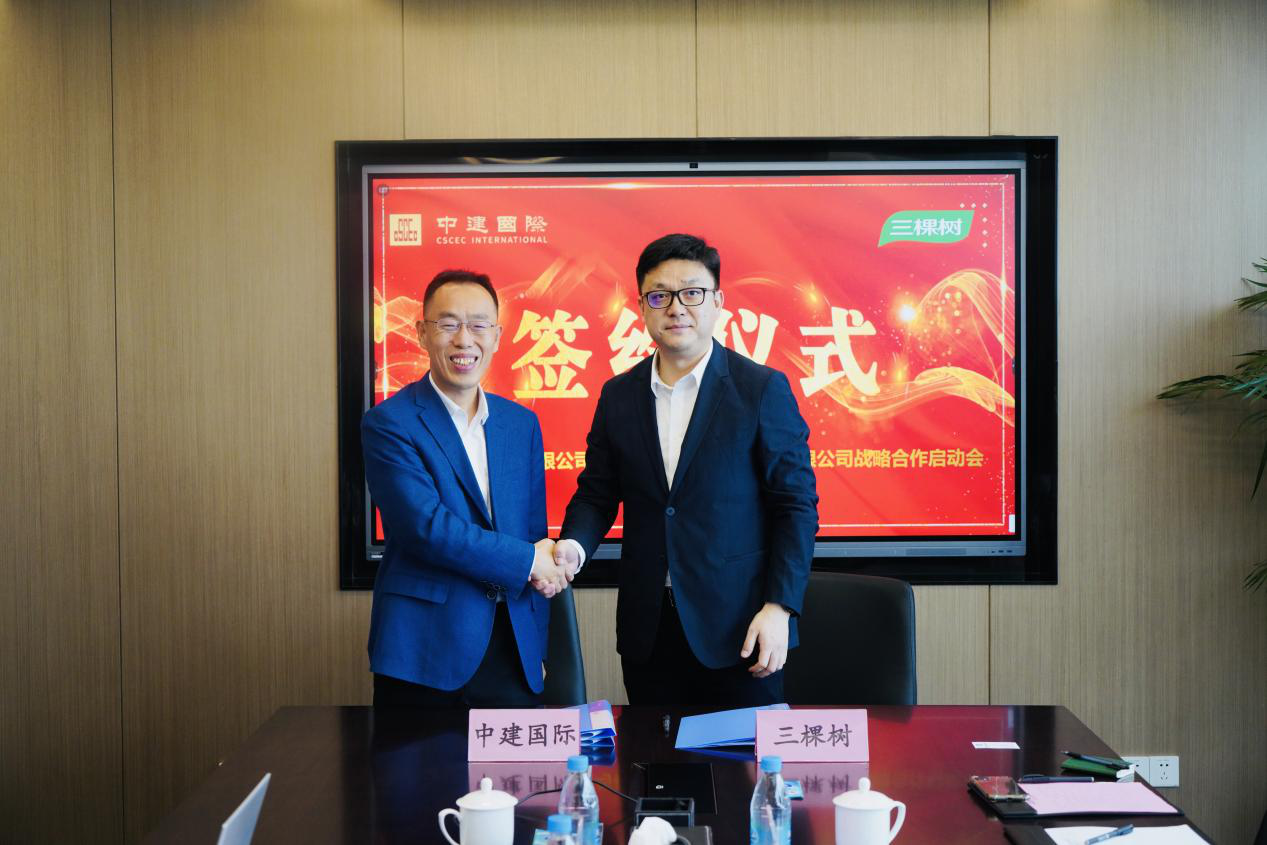 10月26日,三棵樹與中建國際在蘇州簽署戰略合作協議,三棵樹集團副總裁崔景燾、中建國際采購中心總經理宋文雨代表雙方簽約。