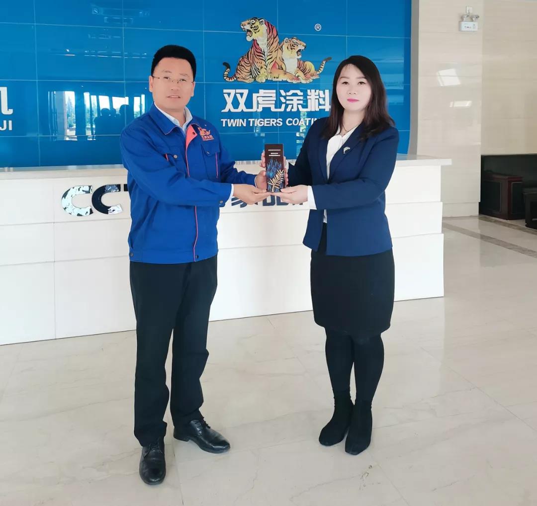 雙虎涂料董事長蔣紅升(左)與涂料采購網(wǎng)市場總監(jiān)江雪合影