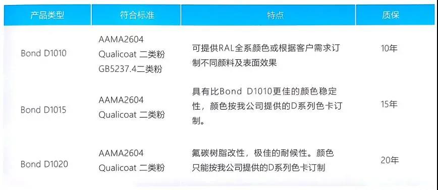 隨著建筑行業的發展,型材廠家的需求也在發生變化,在這個過程中漢森邦德陸續推出了標準耐候粉末涂料Bond CP-04、Bond CP-05、超耐候粉末涂料Bond D1010、D1015、D1020等產品,這些產品具有卓越的流平、耐熱性及耐候性,質保期內不褪色、不粉化,適用于高檔商用建筑以及高紫外線、高濕度環境的應用領域,耐候性最長可達20年等特點,是目前鋁型材噴涂應用的粉末涂料首選產品,同時也得到了鋁型材行業龍頭羅普斯金的認可,并為眾多鋁型材行業大型企業穩定供貨。