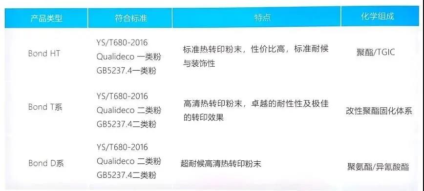 談到應用于鋁型材行業的另一款產品熱轉印粉末,韓總表示,在這款產品進入市場的初期,市場中一直都存在著轉印清晰度不佳的問題,而他們在經過持續不斷的研發和數萬次的實驗后,才有了紋路清晰、滲透性好、機械性能優良、耐候性優異的現在的熱轉印產品,后來也被越來越多的同行業企業所引用,大大推動了轉印粉行業的發展,他們的轉印粉末有Bond HT 、Bond T、Bond D等型號,能夠滿足市場的各種需求。