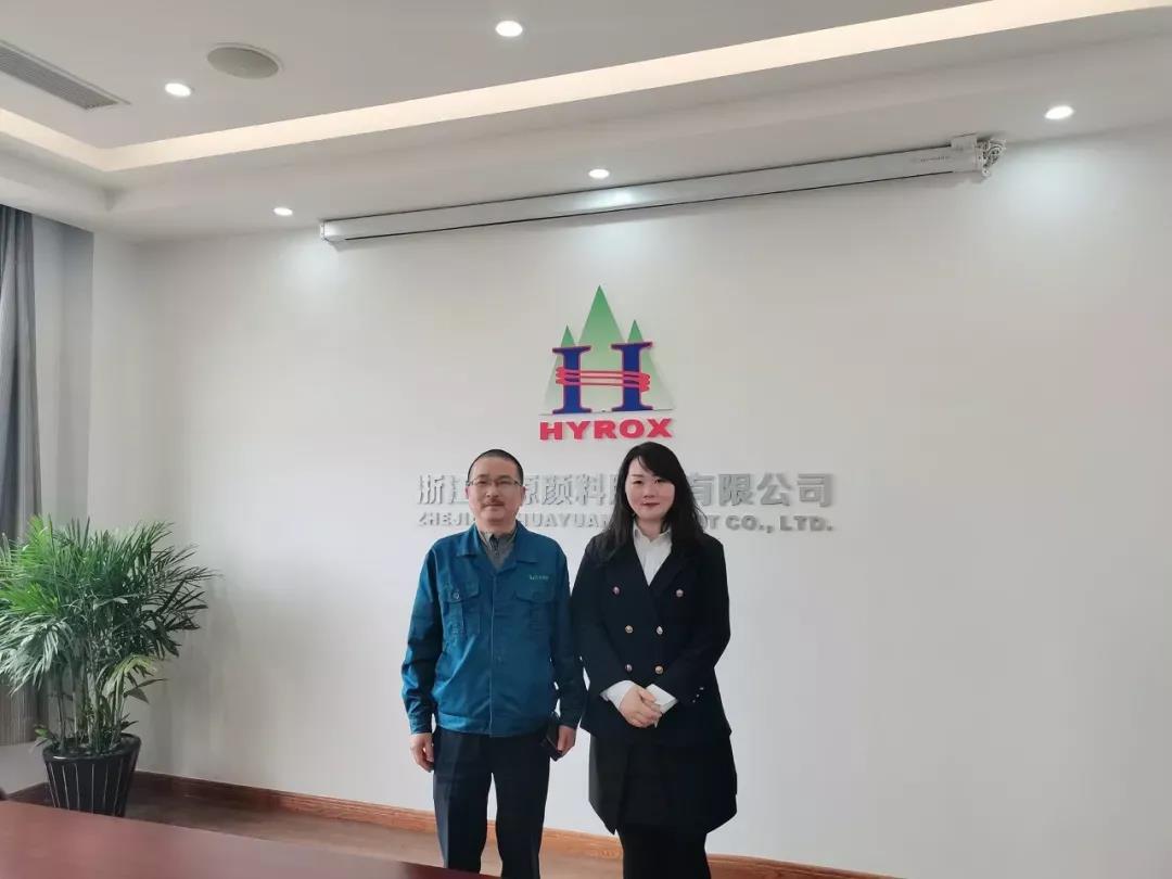 涂料采購網市場總監江雪(右)與華源顏料董事長竺增林(左)合影
