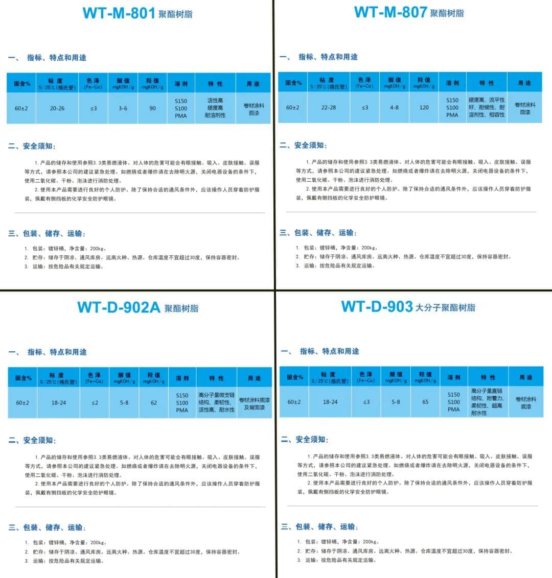 WT-M-801聚酯樹脂活性高、硬度高,耐溶劑性強,能夠更好地滿足卷材涂料、面漆的使用需要。WT-M-807聚酯樹脂硬度高、流平性好、耐候性、耐溶劑性強,并能夠快速親和卷材涂料、面漆。WT-D-902A聚酯樹脂采用高分子量微支鏈結構,柔韌性、活性、耐水性等產品指標均遙遙領先與業內同類型產品,因而除了上述兩種介質以外,這款新興產品也適用于底漆。此外,WT-D-903大分子聚酯樹脂創新性地以其高分子量直鏈結構,面向卷材涂料和底漆能夠發揮出發揮出產品在附著力、柔韌性、耐水性方面的性能優勢。這些產品可以提供卓越的保護性和耐久性以及持久的色彩。這些性能都經過多年的研究測試并在實際適用中得到證明。