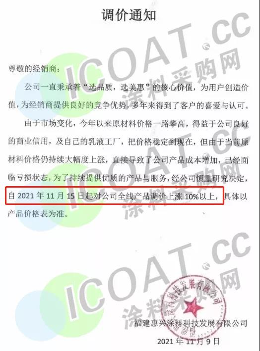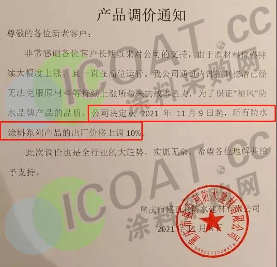此前,重慶市盛百利防水建材也發布調價通知,稱已經無法克服原材料等持續上漲所帶來的成本壓力,為了保證“袖風”防水品牌產品的品質,決定從2021年11月9日起,所有防水涂料系列產品的出廠價格上調10%。