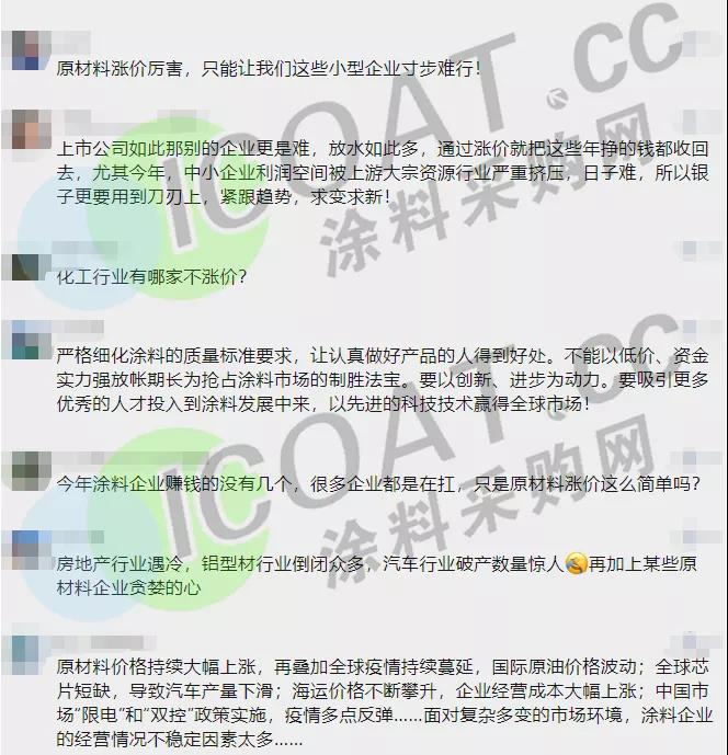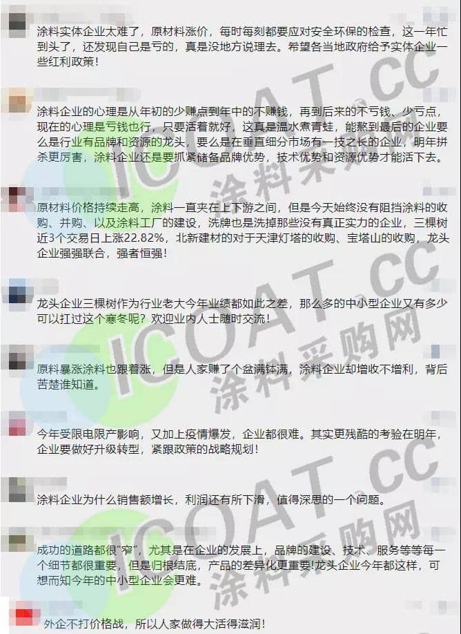 而后不少網友留言,訴說自己的悲慘境地。有人說,原料一直漲價,涂料也想跟著漲,結果人家賺了個盆滿缽滿,涂料企業忙到頭卻發現是一場空,簡直太難了;也有人說,安全壓力、環保壓力再加上此前的限電限產壓力,哪還敢奢望掙錢,不虧損就是好的;更有人表示,看看龍頭老大三棵樹的業績都是如此,中小型企業的情況更是嚴峻,能否扛過這個寒冬都不好說……