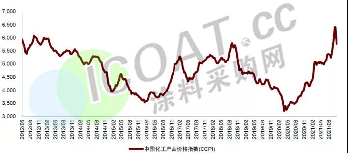 今年年中開始,在成本上行,能耗雙控和缺電等因素導(dǎo)致供給受限等因素共同推動下,化工品價格指數(shù)持續(xù)上漲至近十年新高,多數(shù)化工產(chǎn)品價格處于歷史高位甚至創(chuàng)新高。但四季度下旬以來,受煤炭、天然氣為代表的能源產(chǎn)品價格大幅回落,供應(yīng)端限電限產(chǎn)影響減弱,產(chǎn)能緩慢擴(kuò)張且有愈演愈烈之勢,上游成本壓力隨煤炭價格下滑減輕,化工產(chǎn)品價格指數(shù)沖高回落。截至2021年11月6日,中國化工產(chǎn)品價格指數(shù)為5768點(diǎn),較年內(nèi)高點(diǎn)下滑10.1%,化工品現(xiàn)貨價格也在逐步回落。