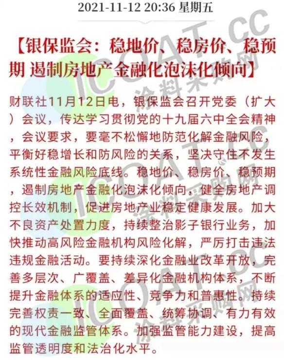 而后,央行發聲,堅決遏制金融服務業領域的壟斷和資本無序擴張,維護房地產市場平穩健康發展。銀保監會同步發聲表示,穩地價、穩房價、穩預期,遏制房地產金融化泡沫化傾向,健全房地產調控長效機制,促進房地產業穩定健康發展。