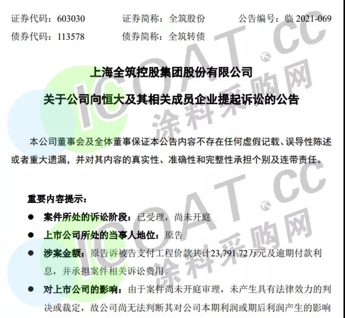 近日,建筑裝飾行業(yè)上市公司全筑股份公告稱,公司及全資子公司全筑裝飾與恒大地產(chǎn)集團(tuán)及其相關(guān)成員企業(yè)因工程款糾紛事宜已向多地法院提起訴訟。10月8日至11月16日,全筑股份已陸續(xù)收到法院關(guān)于333起訴訟的《受理案件通知書》。全筑股份訴恒大方面支付工程價(jià)款共計(jì)2.38億元及逾期付款利息,并承擔(dān)案件相關(guān)訴訟費(fèi)用。