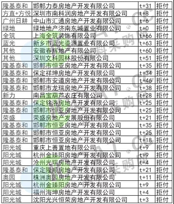 從逾期的行業(yè)看,主要集中在商貿(mào)、地產(chǎn)領(lǐng)域,地產(chǎn)領(lǐng)域的企業(yè)包括:隆基泰和系下的多個(gè)企業(yè),武漢綠地城置業(yè)有限公司。建筑領(lǐng)域包括江蘇省建筑工程集團(tuán)有限公司、金鋼幕墻等。該名單涉及眾多知名企業(yè),其中蘇寧系就涉及超46家企業(yè),另外名單也涉及一家恒大系企業(yè),恒大新能源汽車投資。另據(jù)網(wǎng)絡(luò)曝光,多家房地產(chǎn)企業(yè)商票兌付情況為拒付,部分名單如下: