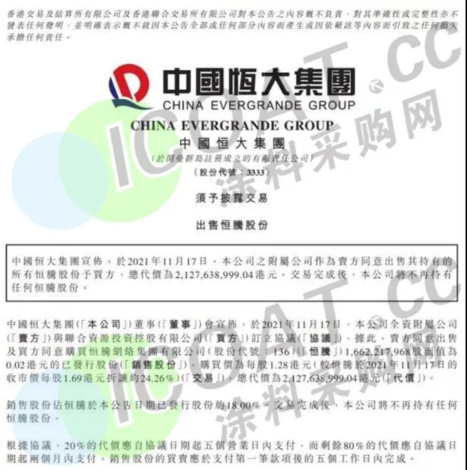 中國(guó)恒大港交所公告稱,于2021年11月17日,公司之附屬公司作為賣方同意出售其持有的所有恒騰股份予買方,總代價(jià)為21.27億港元。交易完成后,本公司將不再持有任何恒騰股份。據(jù)報(bào)道,此前,中國(guó)恒大已經(jīng)拋售恒騰網(wǎng)絡(luò)22億股,套現(xiàn)額88.08億港元。至此,中國(guó)恒大累計(jì)拋售恒騰網(wǎng)絡(luò)38.6億股,套現(xiàn)額超100億港元。