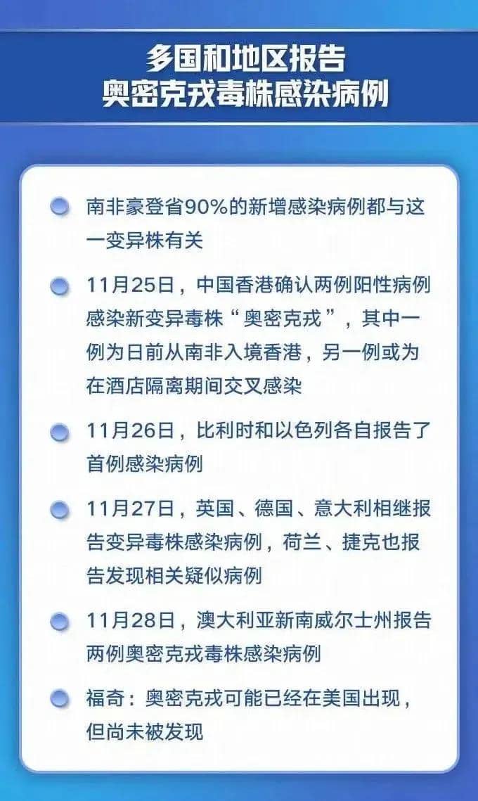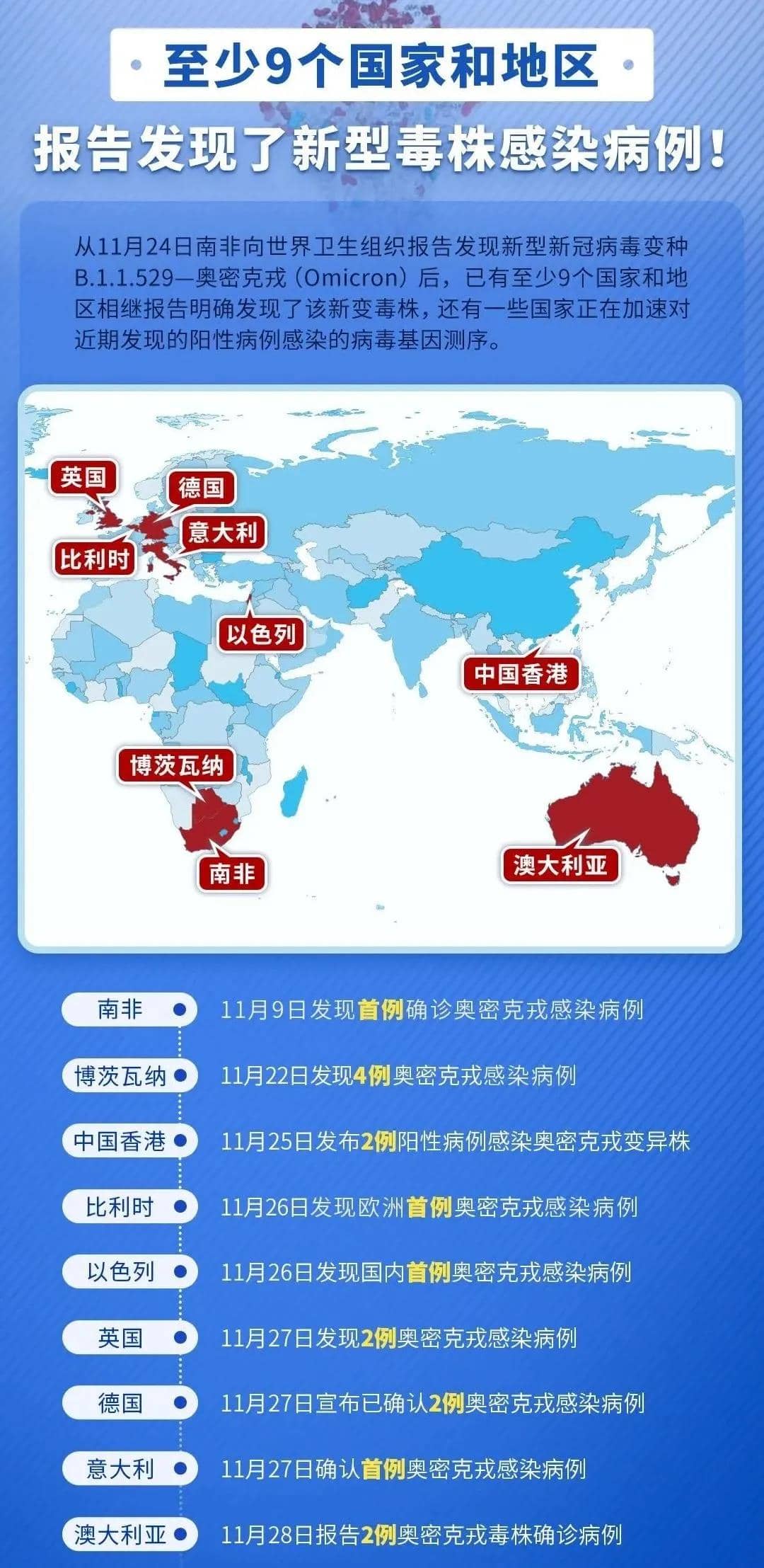 目前南非已確診至少100例,博茨瓦納4例,香港2例,英國(guó)2例,比利時(shí)1例,以色列1例,丹麥1例,這些確診病例都與南非旅行有直接的關(guān)系,約20個(gè)國(guó)家和地區(qū)政府陸續(xù)發(fā)布或準(zhǔn)備出臺(tái)針對(duì)南部非洲國(guó)家航班和旅客的入境限制措施。