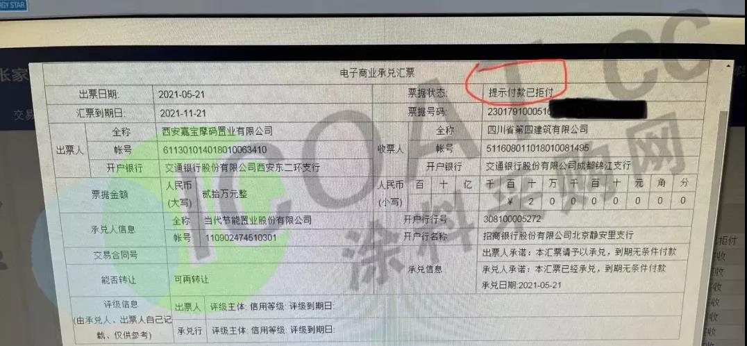 某粉絲爆料稱:手中持有的一張20萬商票,本該于11月21日兌付,但截至目前票據狀態卻顯示已拒付。從票據中能夠看出,該筆商票出票人為西安嘉寶摩碼置業有限公司,而承兌人信息欄則顯示為當代節能置業股份有限公司。