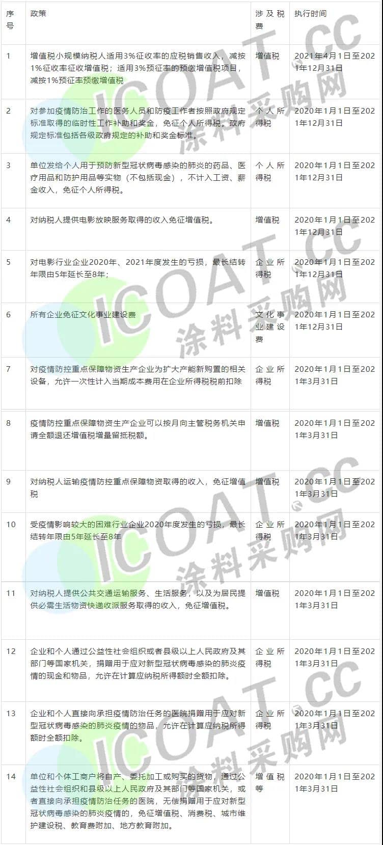 據(jù)涂料采購網(wǎng)了解,在2021年底前到期除了增值稅減按1%之外,還包括免征文化事業(yè)建設(shè)費(fèi)、單位發(fā)給個(gè)人的防疫用品等免征個(gè)稅等多個(gè)優(yōu)惠政策。
