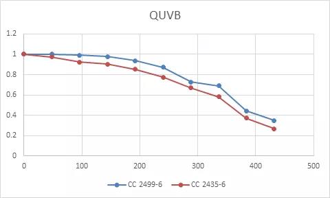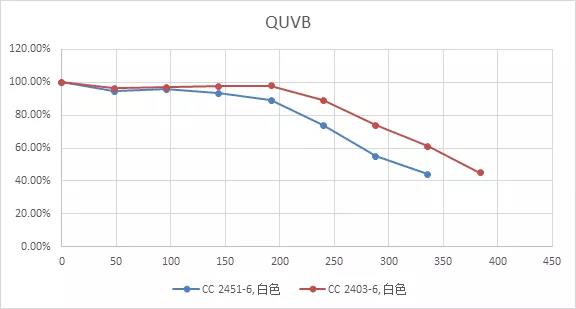 老化測試條件:QUVB313,輻射強度0.75W/m²,4小時UV照射@50°C,4小時冷凝@40°C
