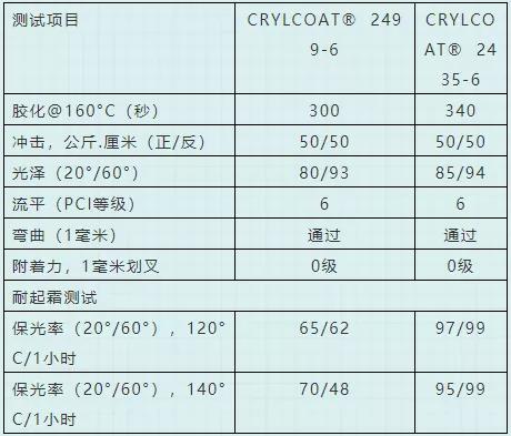 CRYLCOAT®2499-6和CRYLCOAT®2435-6是兩款可以在160度/15分鐘完全固化的產品,都具有比較好的外觀,機械性能和耐老化性能。CRYLCOAT®2435-6具有更好的耐起霜性能,比較適合噴涂于厚工件。