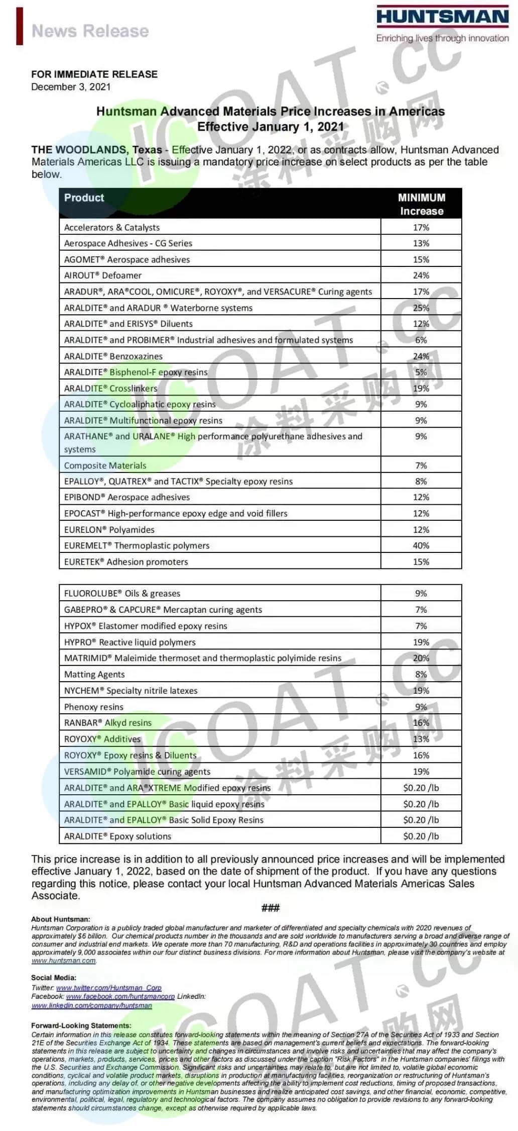 將于2022年1月1日起上調(diào)北美地區(qū)(美國(guó)和加拿大)的部分樹(shù)脂的售價(jià),上漲0.15-0.20美元/磅(約2115-2810元/噸)。