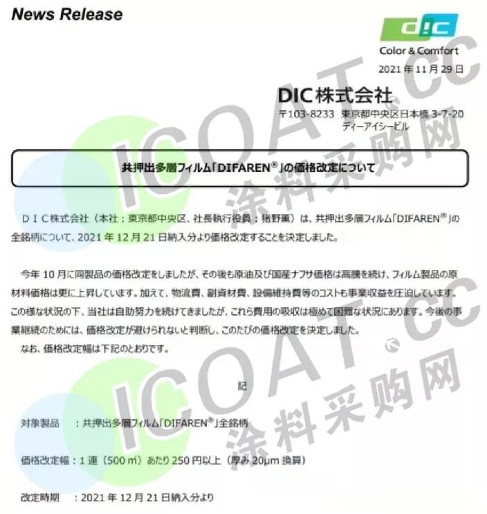 DIC株式會(huì)社:產(chǎn)品上調(diào)14160元/500平米