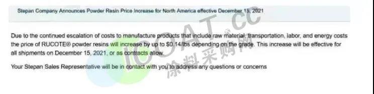自12月15日起上調(diào)北美地區(qū)RUCOTE® 粉末樹(shù)脂的價(jià)格,上漲0.14美元/磅(約1967元/噸)。
