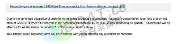 自2022年1月1日起上調(diào)北美地區(qū)CASE STEPANPOL® 多元醇的價(jià)格,上漲最高達(dá)0.20美元/磅(約2810元/噸)。