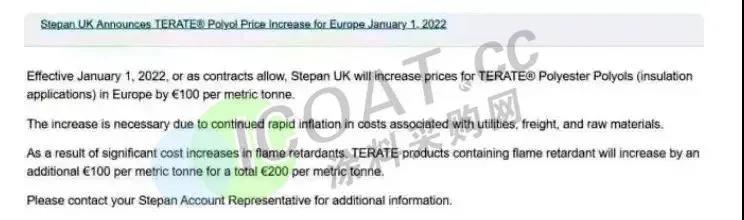 斯泰潘波蘭將于2022年1月1日起上調(diào)歐洲地區(qū)STEPANPOL® 聚酯多元醇(絕緣應(yīng)用)的價(jià)格,上漲100歐元/噸(約721元/噸),此外由于阻燃劑成本顯著增加,阻燃級(jí)產(chǎn)品額外上調(diào)100歐元/噸,總計(jì)上漲200歐元/噸(約1442元/噸)。