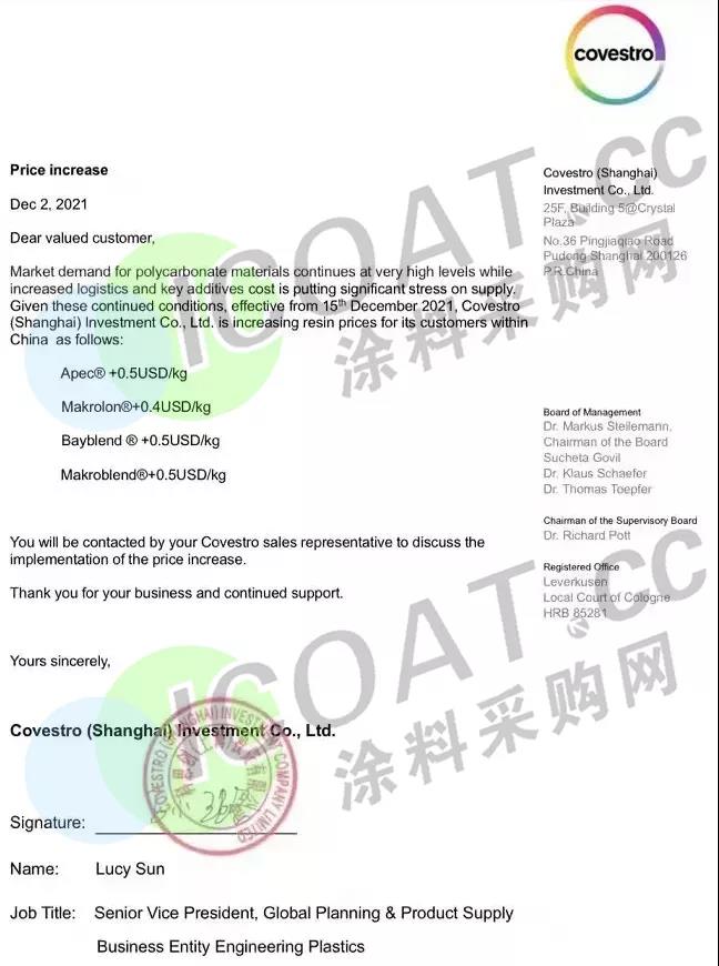 科思創(chuàng):最高上漲3185元/噸12月15日起上調(diào)中國(guó)地區(qū)PC系列產(chǎn)品的售價(jià):