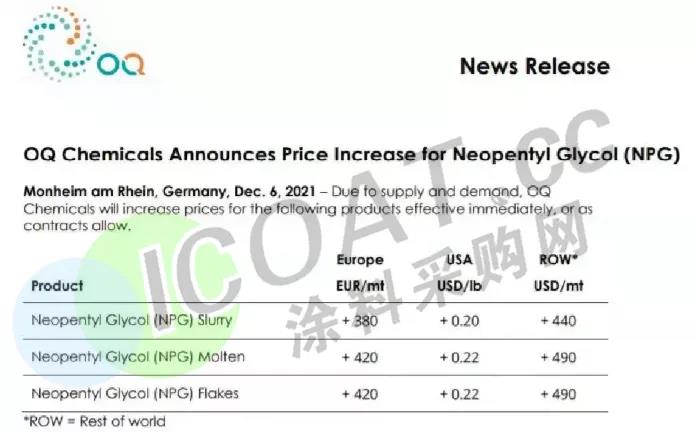 將于2022年1月1日起在全球范圍內(nèi)上調(diào)所有等級(jí)的新戊二醇(NPG)產(chǎn)品的售價(jià),其中除歐洲和美國(guó)外(包括中國(guó)),其他地區(qū)上漲440-490美元/噸(約2808-3121元/噸)之間。