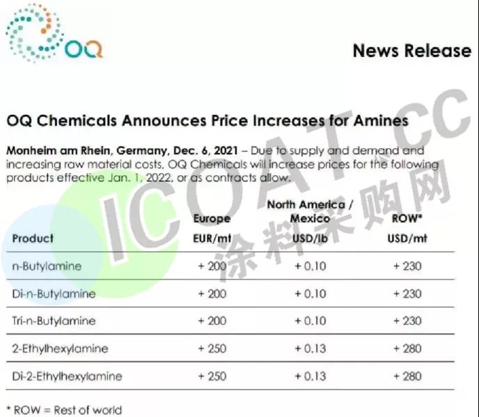 將于2022年1月1日起在全球范圍內(nèi)上調(diào)正丁胺、二正丁胺、三正丁胺等在內(nèi)所有等級(jí)的胺類產(chǎn)品的售價(jià),其中除歐洲和美國(guó)外(包括中國(guó)),其他地區(qū)上漲230-280美元/噸(約1465-1783元/噸)之間。