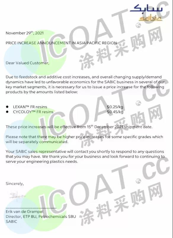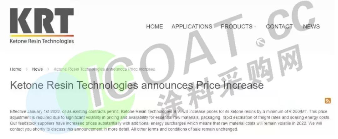 將于2022年1月1日起在全球范圍內(nèi)上調(diào)公司所有樹(shù)脂產(chǎn)品的售價(jià),至少上漲250歐元/噸(約1801元/噸)。