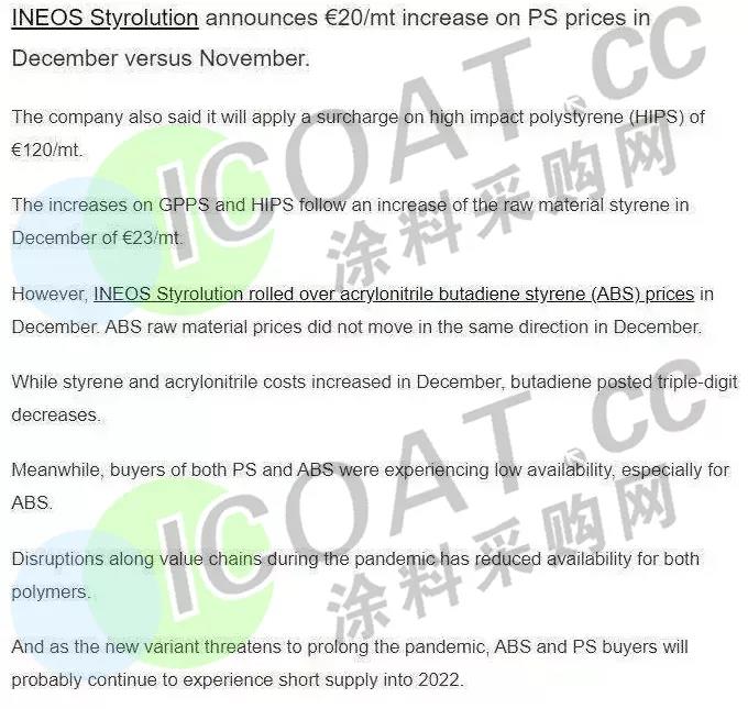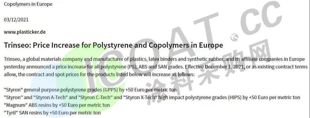 自12月1日起,以下產(chǎn)品的合同和現(xiàn)貨價(jià)格將上調(diào):斯泰隆(STYRON™)GPPS上調(diào)50歐元/噸(約359元/噸);
