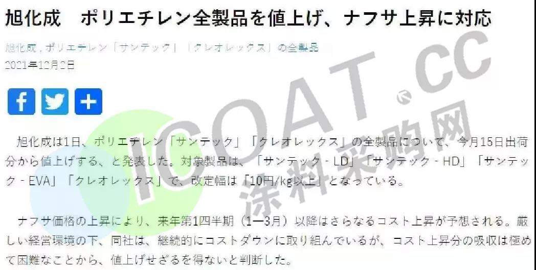 將于12月15日起上調(diào)公司Suntec LDPE/HDPE/EVA以及Creolex mPE(茂金屬PE)等制品的價(jià)格10日元/千克(約563元/噸)。