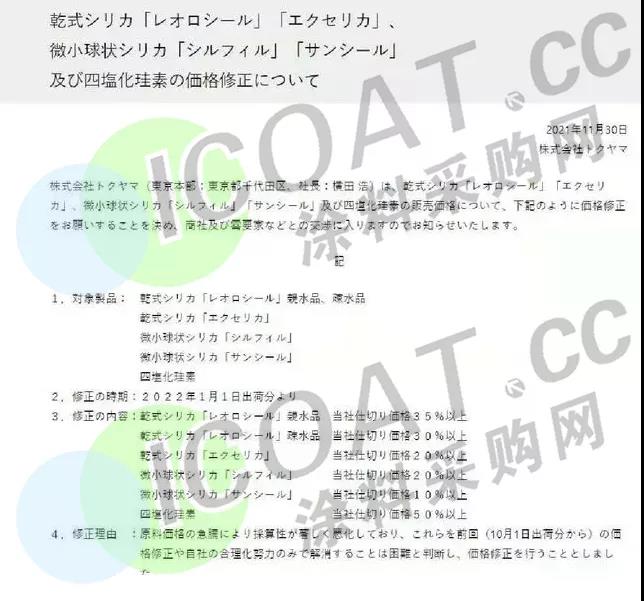 將于2022年1月1日起上調(diào)白炭黑(二氧化硅)產(chǎn)品的售價(jià),REOLOSIL™氣相法白炭黑親水性產(chǎn)品上調(diào)35%以上,REOLOSIL™氣相法白炭黑疏水性產(chǎn)品上調(diào)35%以上,EXCELICA™氣相法白炭黑上調(diào)20%以上。Silfil™球形白炭黑上調(diào)20%以上,Sunseal™球形白炭黑上調(diào)10%以上,四氯化硅產(chǎn)品上調(diào)50%以上。