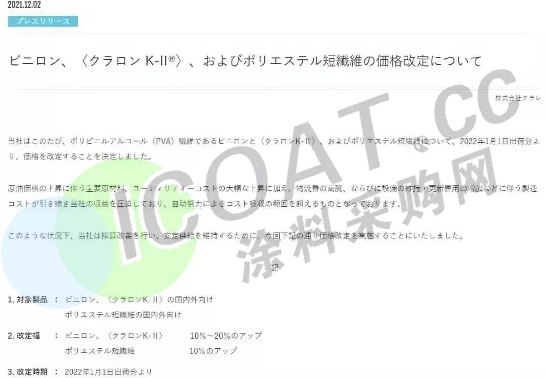 將于2022年1月1日起,在全球范圍內(nèi)上調(diào)部分纖維產(chǎn)品的售價(jià),其中KURALON™和MINTVAL/KURALON™ K-II 聚乙烯醇(PVA)纖維產(chǎn)品漲幅10%-20%,聚酯(PET)短纖產(chǎn)品漲幅為10%。