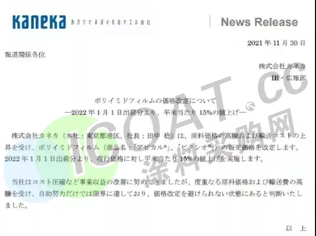 將于2022年1月1日起上調(diào)聚酰亞胺(PI)薄膜產(chǎn)品的售價(jià),漲幅在15%以上。