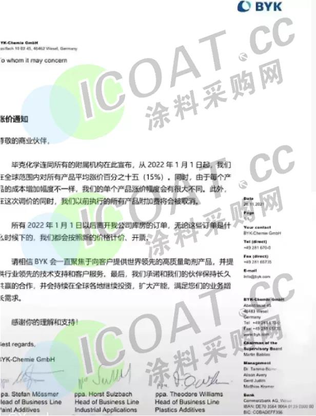?在全球范圍內(nèi)上調(diào)其油漆和涂料行業(yè)助劑的價(jià)格,包括Attagel®、Dispex®、Efka®、Foamaster®、FoamStar®、Hydropalat®、Irgafos® 、Irganox®、Loxanol®、Rheovis®、Sterocoll®、Tinuvin® 和 Uvinul® 系列。新價(jià)格立即生效,或根據(jù)合同條款允許生效。 此次價(jià)格增幅將達(dá)35%,此舉是為了應(yīng)對(duì)原材料價(jià)格、運(yùn)輸和能源成本的大幅上漲,以及勞動(dòng)力、包裝和維護(hù)成本的上升。