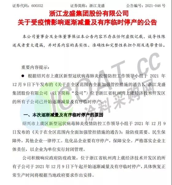 涂料采購網注意到,浙江紹興染料產能占全國的80%左右,被稱為“染料之都”,當地封控加嚴對于全國染料行業的供給都造成了一定的影響。且停產的企業中包括了染料行業兩大巨頭浙江龍盛和閏土股份,二者雙雙停產相當于全國產能的67%被砍斷。坊間甚至有人斷言,這將是繼2019年響水爆炸、2021年浙江限電后的染料行業第三次“危機”。目前紹興上虞出租車、網約車全停,鐵路客運只進不出,染料的市場供給將大大減少。