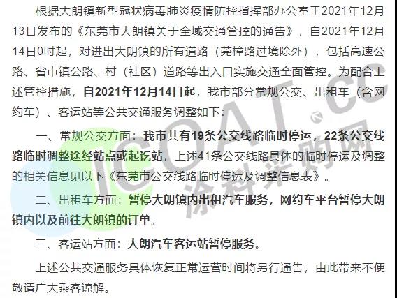 東莞市對大朗鎮全域交通實行臨時管控,對進出大朗鎮的所有道路(莞樟路過境除外),包括高速公路、省市鎮公路、村(社區)道路等出入口實施交通全面管控。管控期間,除持有通行證的疫情防控、應急救援、核酸采樣、物資保障等必需的保障類車輛外,禁止其他一切車輛進出大朗鎮區域,人員原則上只進不出。