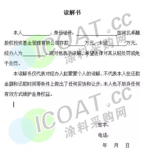 通過債權(quán)人提供的兩份諒解書內(nèi)容可以看出,兩版文件內(nèi)容并不一致,其中都提到了不再追究業(yè)務(wù)員的刑事責(zé)任希望能夠?qū)ζ鋸妮p處罰,但電子版文件明確“不代表在還款金額和時間等條件上做出妥協(xié)和讓步”。盡管如此,多數(shù)債權(quán)人還是表示不愿簽署,不認(rèn)同這個諒解書的措辭。一方面覺得在拿到全部本息之前對業(yè)務(wù)員的所謂“諒解”沒有任何意義,另一方面,也擔(dān)心自己一旦“簽字畫押”,很有可能被人利用,在文本上進(jìn)行修改和“添油加醋”,最終糊里糊涂的“自愿”放棄了債權(quán)人權(quán)力。