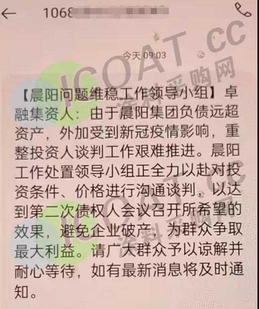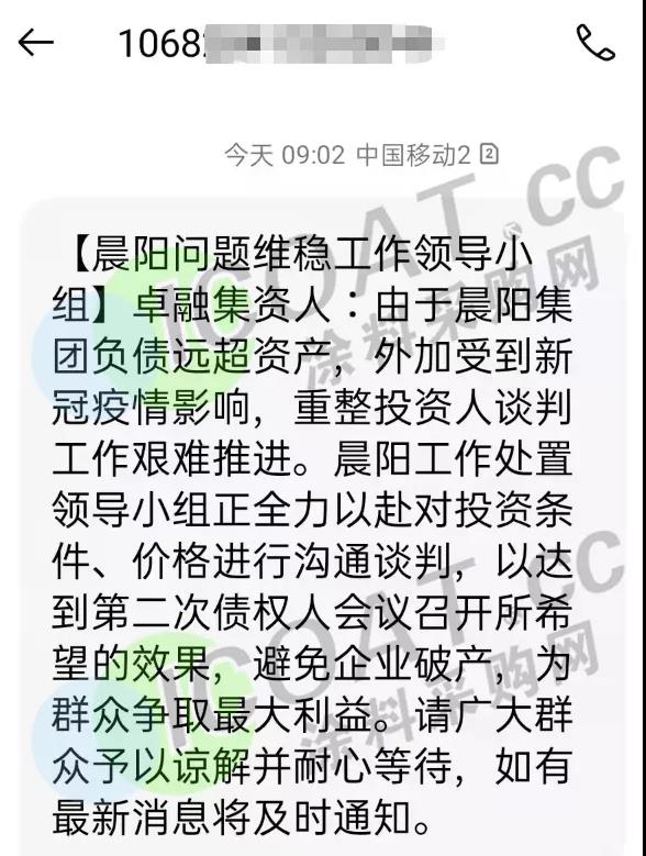 臨近年末,晨陽債權(quán)人仍沒有停下追償?shù)哪_步,無論是試圖與當(dāng)?shù)卣M(jìn)行溝通,還是對于業(yè)務(wù)員和相關(guān)人員的電話詢問,他們都在竭盡全力的維護(hù)自身的權(quán)益,不希望自己辛苦掙來的錢變成“非法融資”繼而難以收回,但結(jié)果并不如人意。部分債權(quán)人曬出了近期收到的短信,短信稱二次債權(quán)人會議已經(jīng)推遲,且尚未給出準(zhǔn)確的時間。
