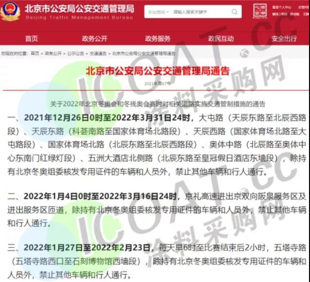 而在此前,北京市公安局公安交通管理局在其官方網站發布《關于2022年北京冬奧會和冬殘奧會賽時對相關道路實施交通管制措施的通告》稱,決定于12月26日0時至2022年3月31日24時,對部分路段采取分時、分段采取交通管制措施,共計96天。