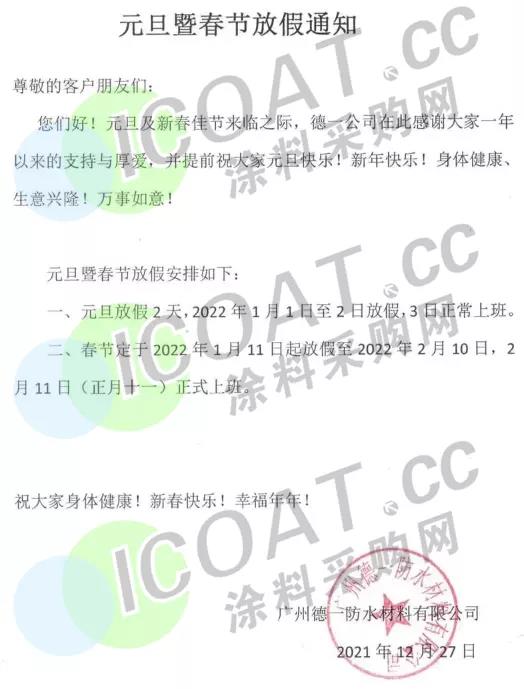 廣州德一防水材料有限公司:春節定于2022年1月11日放假至2022年2月10日,2月11日(正月十一)正式上班。
